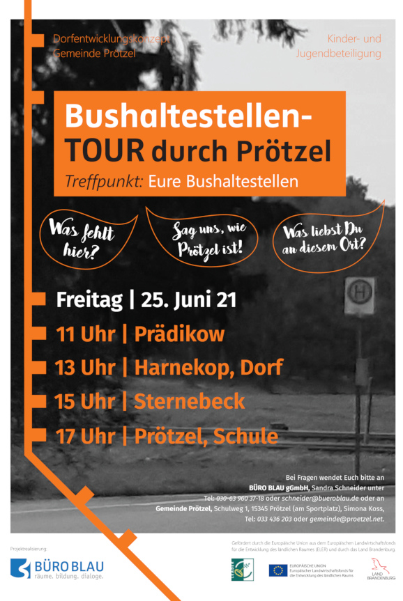 In den Ortsteilen der Gemeinde Prötzel gibt es keine Räumlichkeiten für Kinder und Jugendliche. Treffpunkte sind die Bushaltestellen in den Dörfern. Diese suchen wir in einer Bushaltestellen-Tour auf, um niedrigschwellig und pandemiekonform mit Kindern und Jugendlichen zu ihren Wünschen und Plänen für die Gemeinde Prötzel ins Gespräch zu kommen.